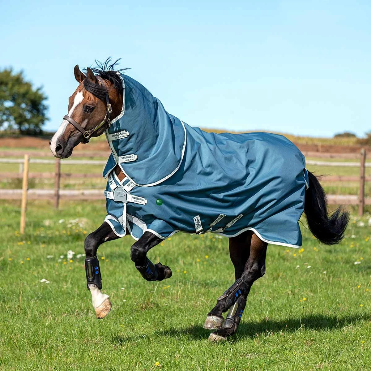 The new AmEco Bravo 12 Plus Turnout 100g is a revolutionary blanket made from plastic water bottles! This sheet has the quality, design and features of Amigo that you love but is made out of sustainable and eco-friendly rPET polyester material. rPET stands for recycled Polyethylene Terephthalate polyester material and it is strong, durable and fully comparable to standard polyester fabric. 218 plastic bottles are recycled to create 1 turnout!
