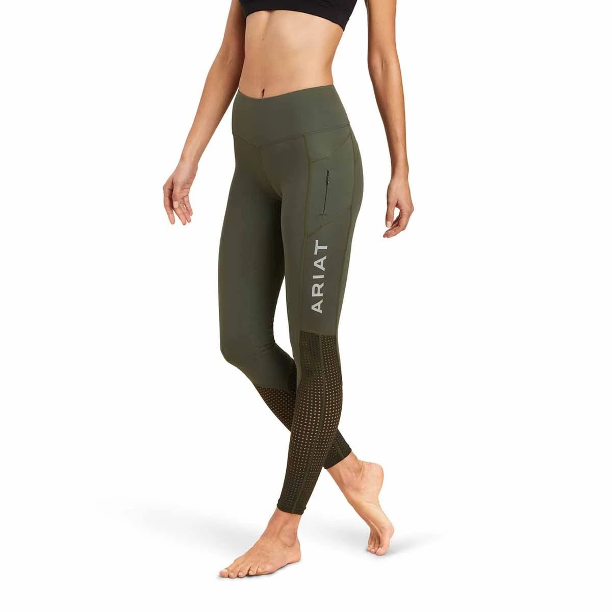 The Ariat EOS Full Seat Ladies Tight offer a flattering silhouette created with compressive support fabric and a wide waistband. Ariat tread silicone full seat adds grip in all the right places and convenient pockets allow you to store your phone and treats galore.