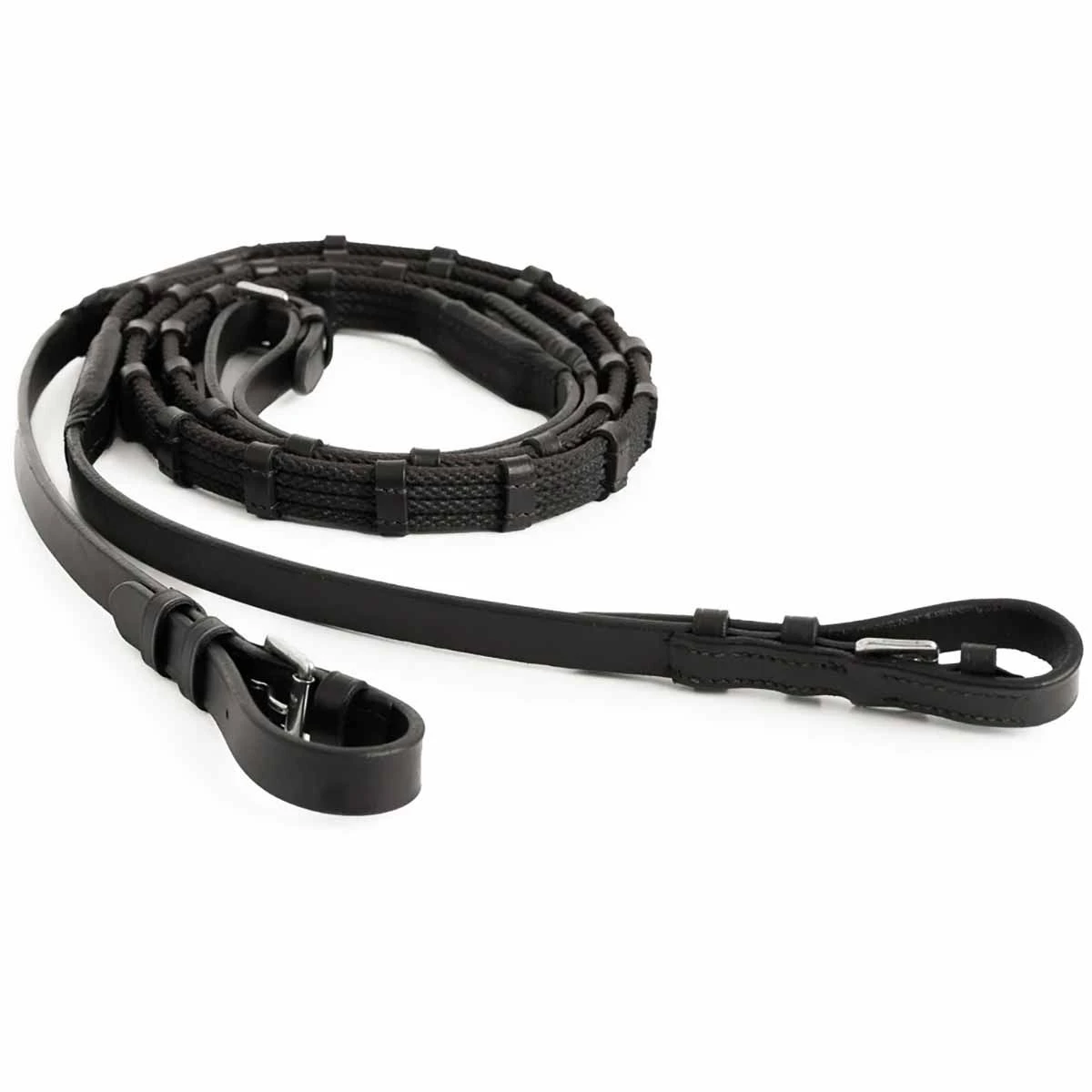 Correct Connect Sure Grip Rubber Reins with 1 Inch Stops are a rubber webbed rein that offers a soft and supple feel, coupled with a superior grip that ensures a steadfast connection even in challenging weather conditions. Designed for convenience, these reins come with a secure buckle fastener for quick and hassle-free adjustments. ¾ wide reins with strategically placed rein stops every 1 inch. Available in both Black and Brown. Approved for use in all types of competitions, making them a versatile choice for riders of all disciplines.