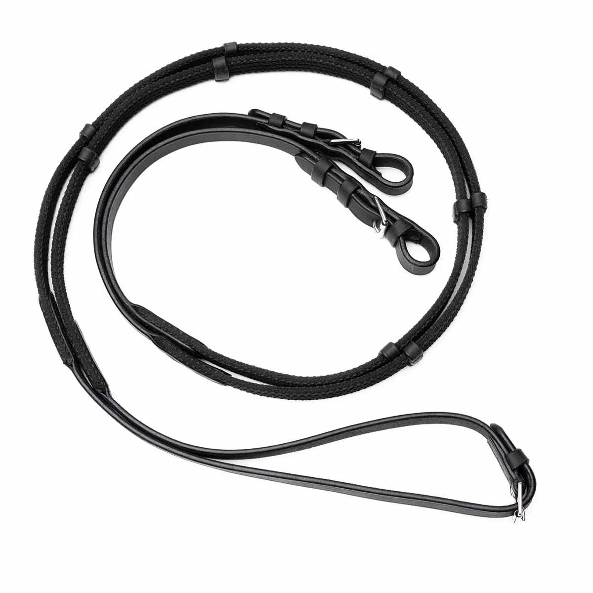 Correct Connect Sure Grip Rubber Reins with Rein Stops are a rubber webbed rein that offers a soft and supple feel, coupled with a superior grip that ensures a steadfast connection even in challenging weather conditions. Designed for convenience, these reins come with a secure buckle fastener for quick and hassle-free adjustments. ¾ wide reins with strategically placed rein stops every 4 inches. Available in both Black and Brown. Approved for use in all types of competitions, making them a versatile choice for riders of all disciplines.