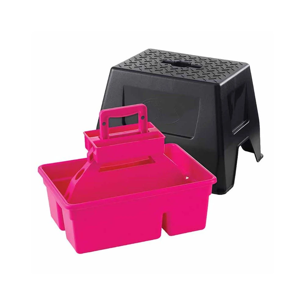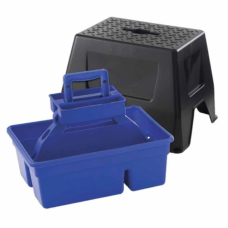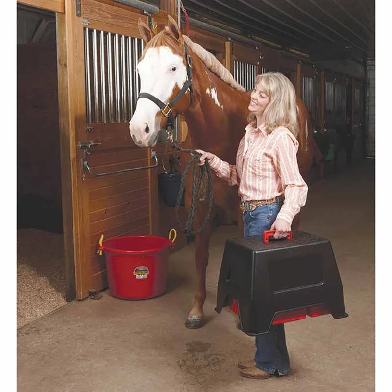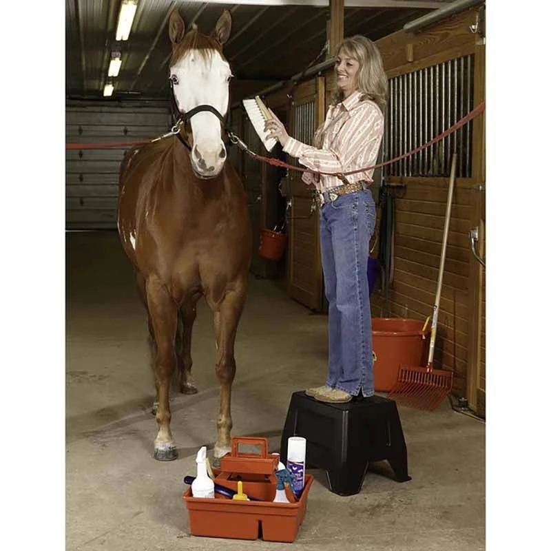 The DuraTote Stool Combo Unit made by Miller Little Giant is a sturdy made, farm tough step stool that incorporates a stow away tote box inside. Use it to hold all your grooming tools and easily secure the stool on top.