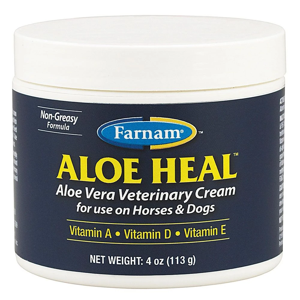 Farnam Aloe Heal contains a high concentration of natural aloe vera plus additional amounts of vitamins A, D and E as well as safflower and sunflower seed oil Soothing and healing action for minor cuts and skin abrasions Keeps wounds moist so they can heal quickly with minimal hair loss Soothing, moist but never greasy Economical to use Approved for use on horses and dogs 4 oz container