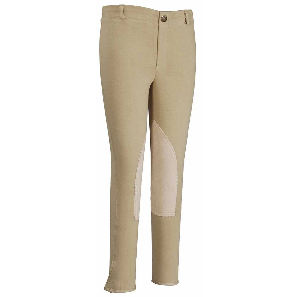 Tuff Rider Cotton Pull On Childs have the traditional look you want without the high price. These pull on breeches feature a false fly, belt loops, imitation leather knee patches and hook and loop ankle closures.