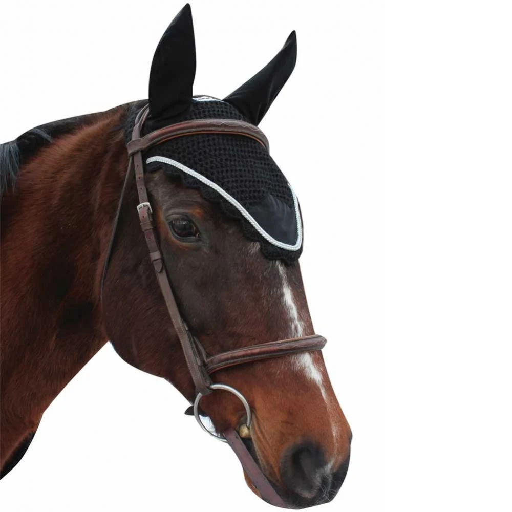 The Tuff Rider Fly Bonnet With Silver Lurex Rope has a blanket front patch ideal for embroidering your farm or sponsor logo. This Fly bonnet is a great idea for marketing or as a horse show prize. Made in soft crochet material with stretch ears and metallic lurex rope piping, this sophisticated fly bonnet is a great way to accent your horse’s good looks while blocking nuissance flies.