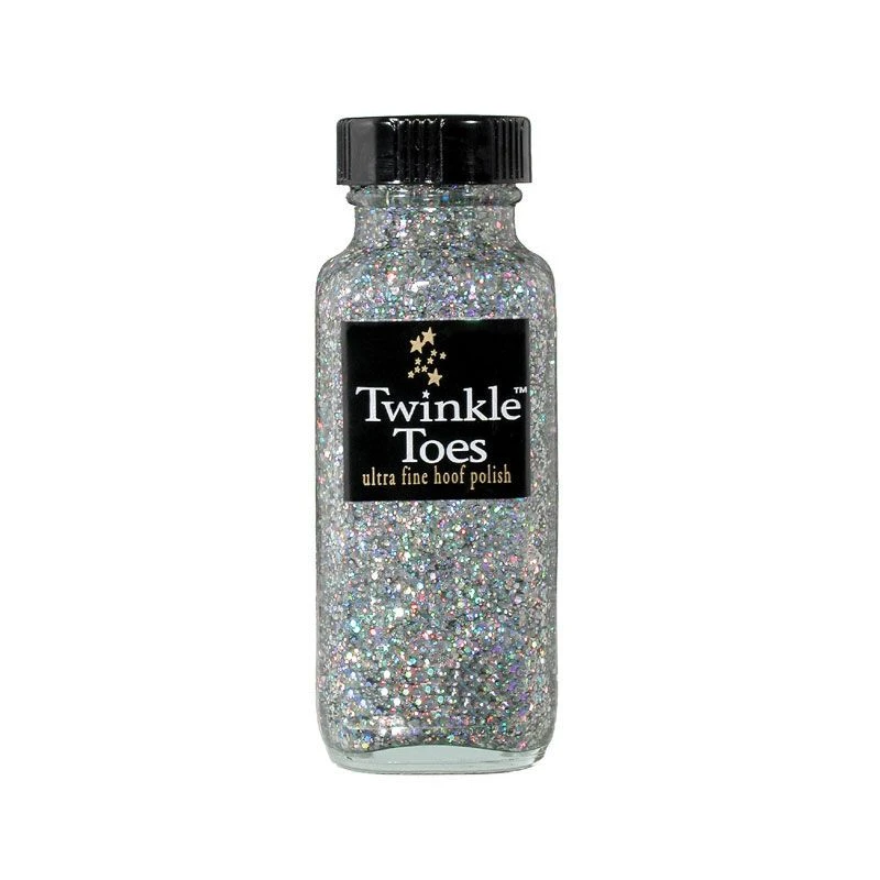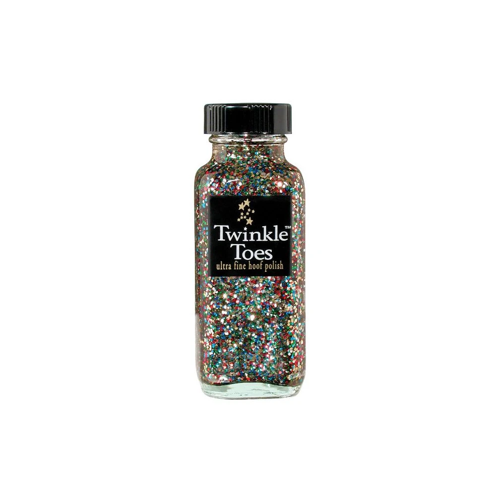Twinkle Toes Hoof Polish makes hooves dance with sparkle. Colors: Rainbow stars (purple, blue and burgundy glitter with silver rainbow stars), copper, black, gold, silver, confetti.