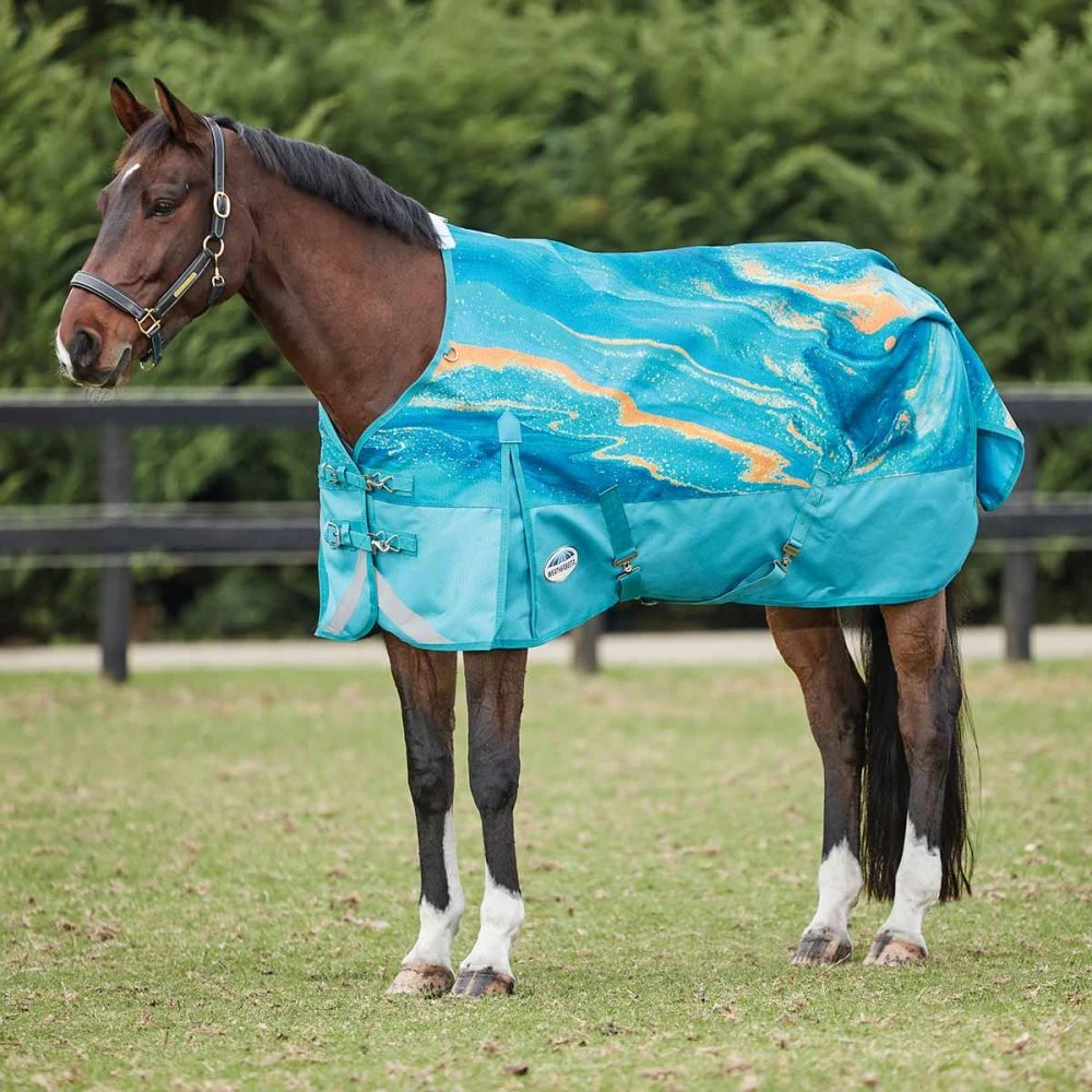 This blanket offers ultimate comfort for your horse, with a memory foam wither relief pad that contours to the horse’s shape and lifts the blanket off the wither to reduce rubbing. The Quick Clip front closure is adjustable and the NEW extra large tail flap gives extra protection. Traditional side gussets allow for natural movement and twin low cross surcingles and elasticized adjustable and removable leg straps create a secure and comfortable fit.